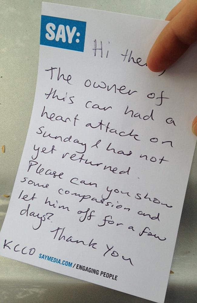 The note begs for commiseration and the hand written pleas claims the owner of the vehicle “had a heart attack on Sunday”.