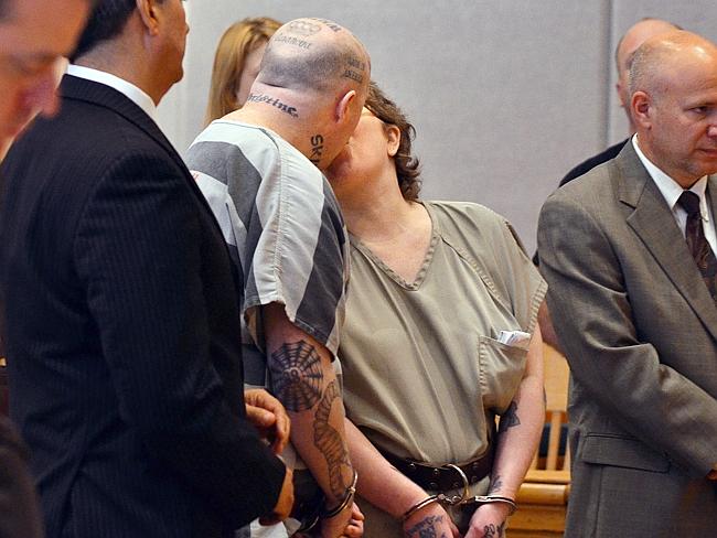 Jeremy Moody, left, kisses his wife, Christine Moody, right, while remaining with their attorneys in the shortly before they were both sentenced to life in jail. Source: AP