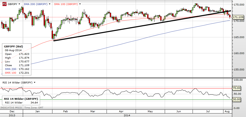 The GBP/JPY is showing a strong uptrend, with long-term highs posted at 175.30 But we are seeing prices drop below the 100-day moving average and break the uptrend line that started back in February. This suggests that the forex pair has further to fall, and the RSI still has more room to the downside before becoming oversold. Strong support is not seen until we reach 1.6950, so it is prudent for forex traders to wait until price reach these areas before buying again.
