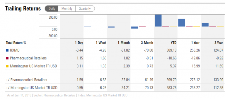 All of this is designed to build on the progress the company made previously, as the group reported 24% growth in the number of prescriptions dispensed during the first quarter. This has enabled RXMD to deliver better returns relative to the industry (as shown in the graphic above). For the March 2018 quarter, RXMD’s net revenue grew 7.36% (to $5,147,345). This was aided by the fact that its wholly-owned subsidiary PharmCo, LLC filled over 22,800 prescriptions in the month of March (generated approximately $1.9 million in net revenues).